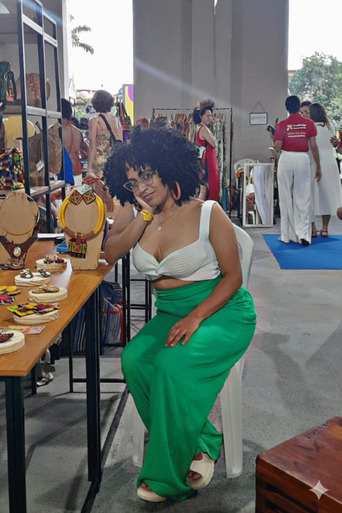 É nesse cenário que empreendedoras negras têm ampliado sua presença na economia criativa de Salvador, impulsionando a moda afro contemporânea com propostas que unem identidade, técnica e propósito. Entre elas está Inajá Erinlê, criadora da Ayoká Acessórios, marca que se destaca pelo trabalho manual, pela criação autoral e pela defesa do uso do tecido africano de forma desmistificada no mercado da moda.